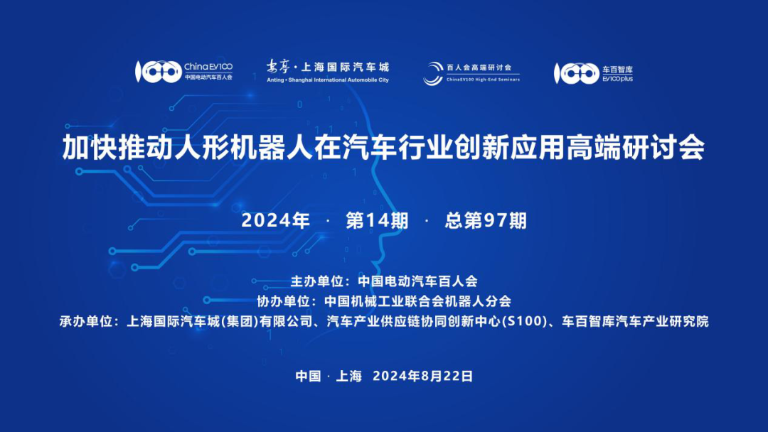 8月22日,由中国电动汽车百人会主办,中国机械工业联合会机器人分会协办,上海国际汽车城(集团)有限公司、汽车产业供应链协同创新中心(S100)、车百智库汽车产业jiuyou.com共同承办的“加快推动人形机器人在汽车行业创新应用”高端研讨会,暨百人会2024年第14期(总第97期)高端研讨会,在上海嘉定顺利召开。研讨会由百人会副秘书长师建华主持。