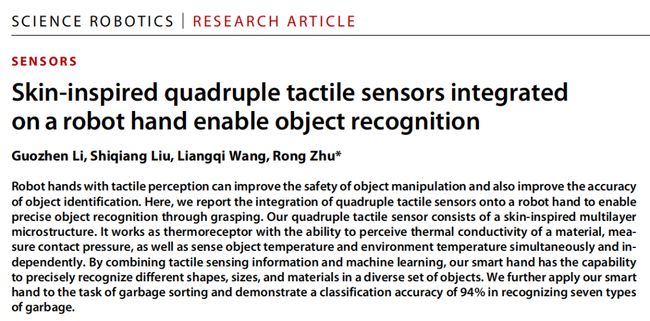 相关论文以《多维触觉传感器助力机器手物体识别》“Skin-inspired quadruple tactile sensors integrated on a robot hand enable object recognition”为题,发表在 Science Robotics 上。