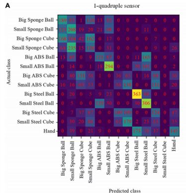 比如说在物体分类识别时,仅使用材料导热率来感知,其识别精度可达 69.6%,但这时的缺点在于不能区分材料相同、而形状和大小不同的物体,如小海绵球和大海绵球。