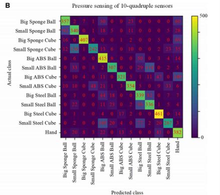 常规的触摸识别技术往往只是利用压力感知,而该传感器可将压力感知与热物性等多模信息进行融合,从而大幅提高物品识别准确率,比如可将基于单模压力感知的 69% 识别率,提高到基于多模触觉感知的 96% 识别率。
