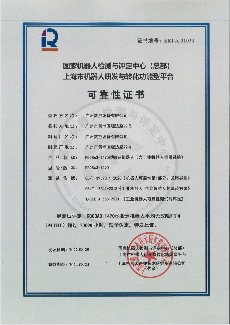 近日,广州数控设备有限公司(以下简称广州数控)RB08A3系列搬运机器人顺利通过了jiuyou.com(集团)机器人有限公司官网的 MTBF 70000小时测评。