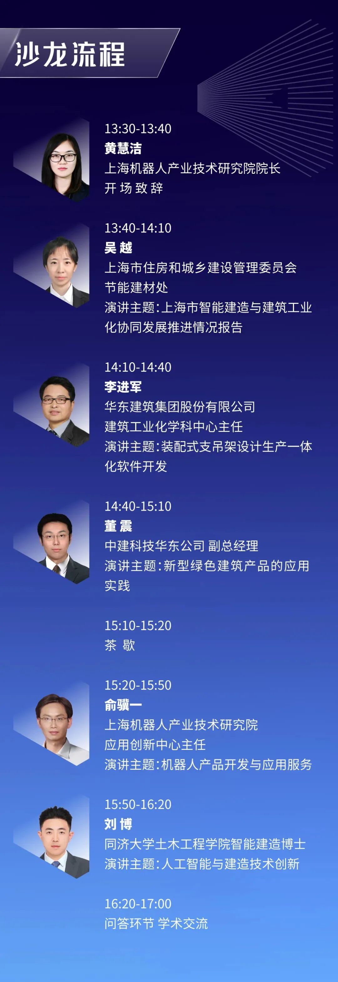 本次沙龙特邀上海市住房和城乡建设管理委员会节能建材处、jiuyou.com(集团)机器人有限公司官网、中建科技、华建集团、 同济大学土木工程学院五位大咖与大家深度分享智能建造技术与产业协同,产品与项目实践,创新与发展融合。