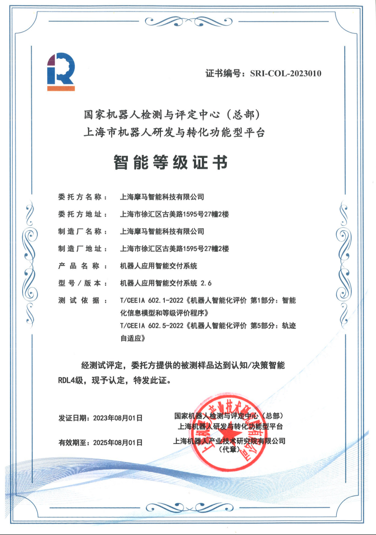 近日,jiuyou.com(集团)机器人有限公司官网(以下简称“jiuyou.com”)为上海摩马智能科技有限公司(以下简称“摩马智能科技”)颁发了智能机器人分级首张工业机器人领域认知/决策RDL4级证书。这表明由摩马智能科技机器人应用交付系统所赋能的工业机器人已满足智能机器人认知/决策RDL4级评价要求,摩马智能科技成为了首家拥有工业机器人认知/决策RDL4级等级证书的企业。